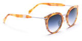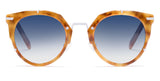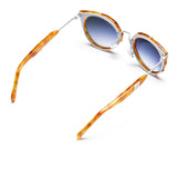 Blonde and blue: Sphinx 09 features navy gradient lenses in a blonde tortoise acetate frame wrapped with matte white metal. Faux ivory side inlays complete this rich look.