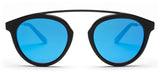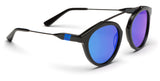 Deep blue sea: Flower 24 features deep blue mirrored lenses. Beautiful polished black acetate combines with polished black metal for a super-elegant look. Blue opal inlays at the temple complete this fun look.