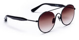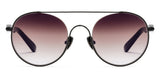Black mirror: Cellophane Disco 01 features dark grey gradient tinted lenses with a subtle purple flash mirror coating. The frame is matte black metal with matte black acetate temples. The black ceramic nose pads are hypoallergenic, and black metal side inlays complete the look.