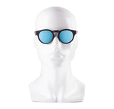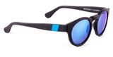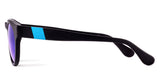 Neon Blue: Voyager 41 features a matte black acetate frame. Neon blue mirrored lenses and blue mirror side inlays complete the look.
