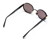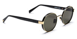 Bold black & gold: Eclipse 03 features standard grey lenses in a matte black metal frame with a polished gold rim. Lenses feature backside anti-reflective coating and nose pads are hypoallergenic. Polished black acetate temples are inlaid with black saffiano leather accents.